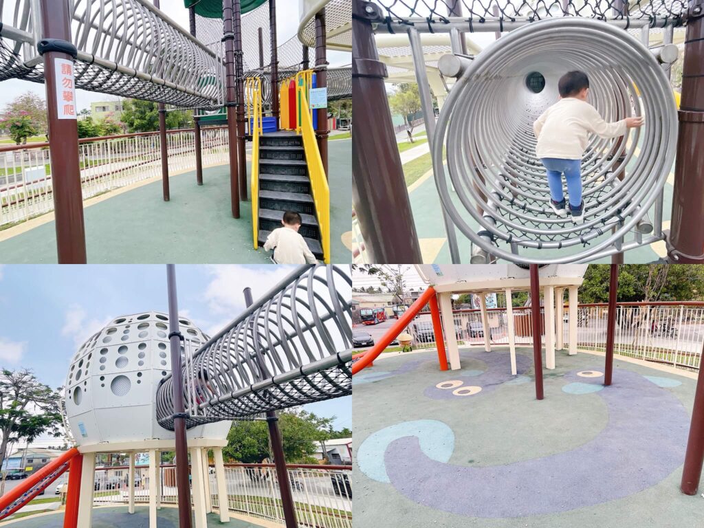 最近比起滑梯,HO哥迷上各式各樣蛇籠攀爬網,可能相較其他款式攀爬網比較有被包覆、不會掉下去的安全感,所以一抵達就直接衝過來了。不得不誇獎屏東特色公園在鐵製攀爬網設計上非常貼心,會在下方多綁一層細網避免孩童踩空掉落,不過腳如果比較小或穿拖鞋的孩子還是不建議玩,縫隙再小還是比他們腳大一點,HO哥偶爾也會有卡住拔不出來哭得咪咪冒冒的突發狀況。