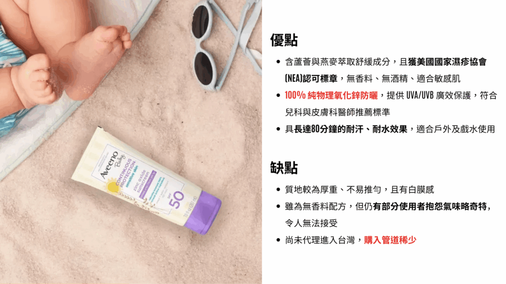 艾惟諾Aveeno 孩童敏感肌膚長效物理防曬霜是一款「專為敏感肌寶寶設計」的物理性防曬霜,主成分為 100% 氧化鋅,添加燕麥與洋甘菊萃取,兼具保濕與舒緩效果,不含香料等刺激成分,且通過皮膚科、小兒科醫師測試,敏弱膚質與異位性皮膚也能安心使用,防水力達 80 分鐘,戶外長時間活動也不怕曬黑或曬傷!在找尋資料時曾有媽媽分享