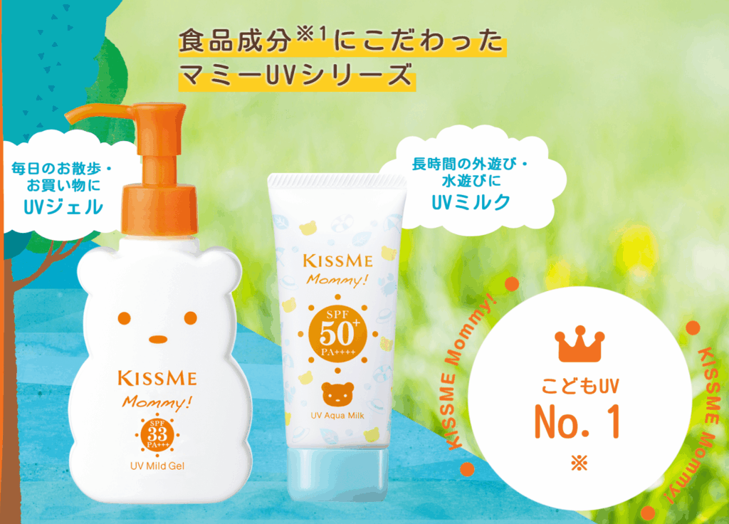 奇士美Kiss Me Mommy 親子防曬乳主打溫和無添加,專為嬰幼兒與敏感肌設計,共有兩款選擇,除了這次介紹的親子防水防曬乳外,另一款為熊熊造型的UV Mild Gel(SPF33 PA+++),適合6個月以上寶寶日常使用,質地水潤不黏膩,但沒有防水功能喔!兩款皆不含酒精、香料、色素與防腐劑,並添加保濕成分,呵護嬌嫩肌膚,是日本爸媽心中的人氣王!